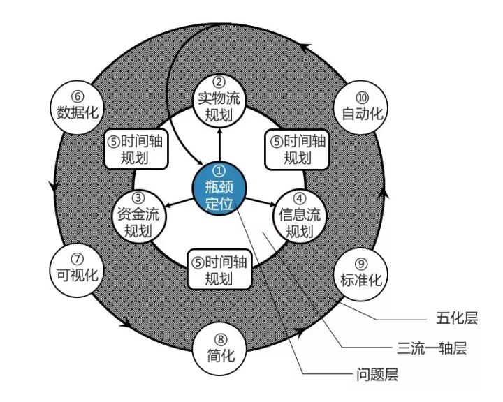 中间层是“三流一轴”层,纵向从三流(实物流、信息流、资金流)维度,横向从时间轴维度,纵横配合进行优化。“三流一轴”层对应的手法有四个,即②实物流规划、③资金流规划、④信息流规划、⑤时间轴规划。